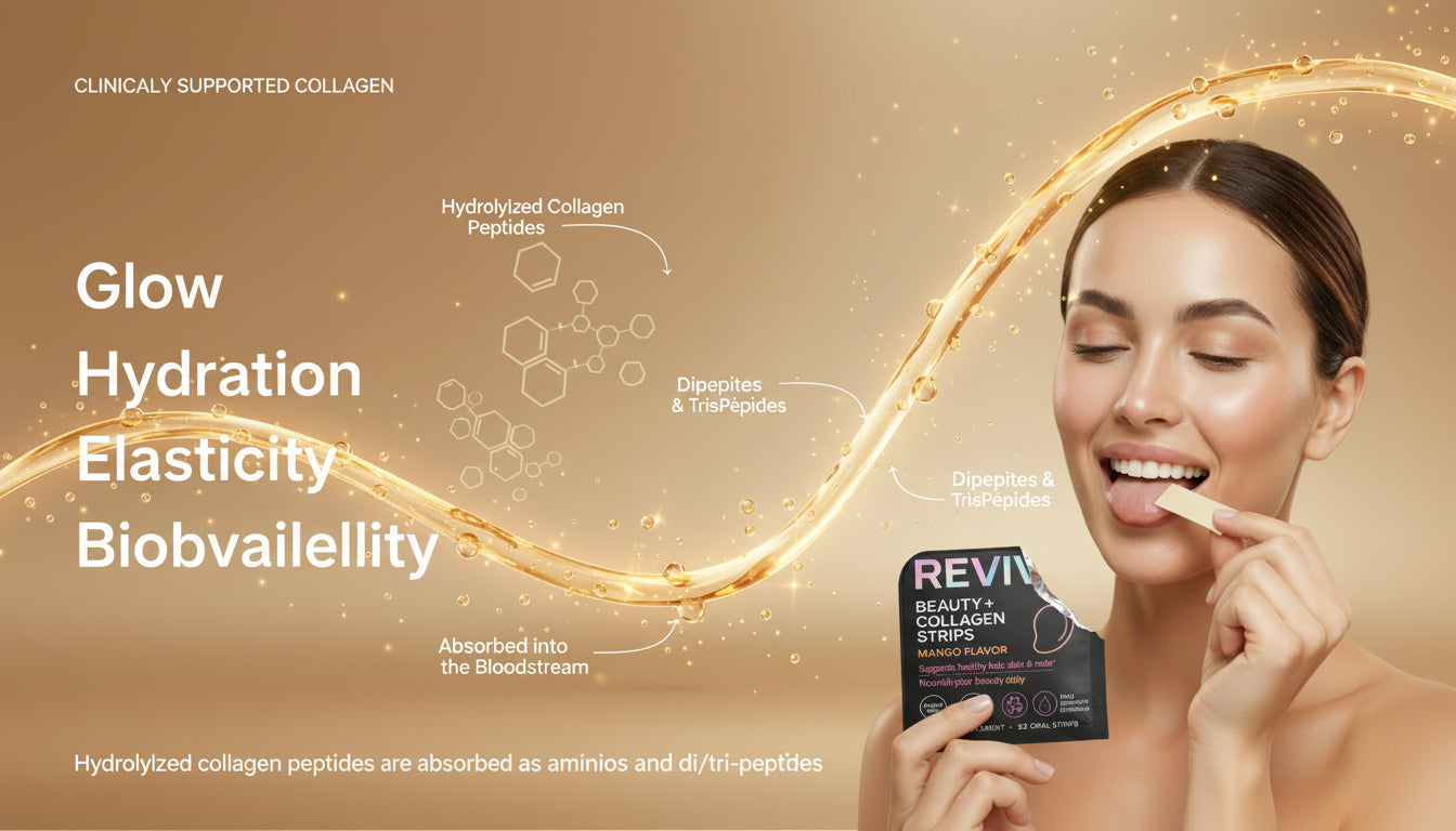 Each Revive strip delivers 100mg of Collagen Peptides—proteins that help maintain your skin’s natural elasticity—and 6mg of Vitamin E, a powerful antioxidant that protects cells from daily stressors.